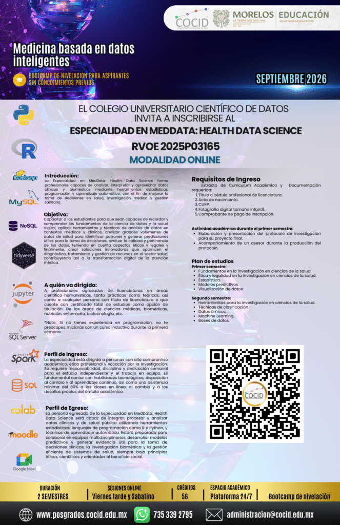 La Especialidad en MedData: Health Data Science está diseñada para formar profesionales capaces de transformar datos clínicos y biomédicos en conocimiento útil para la toma de decisiones en salud. Mediante el uso de herramientas avanzadas de análisis estadístico, inteligencia artificial y gestión de bases de datos médicas, esta especialidad ofrece una formación práctica e interdisciplinaria que conecta la ciencia de datos con las necesidades reales del sector salud. Ideal para médicos, investigadores, ingenieros biomédicos y profesionales de la salud que buscan liderar la innovación basada en evidencia y datos en contextos hospitalarios, clínicos o de investigación.
